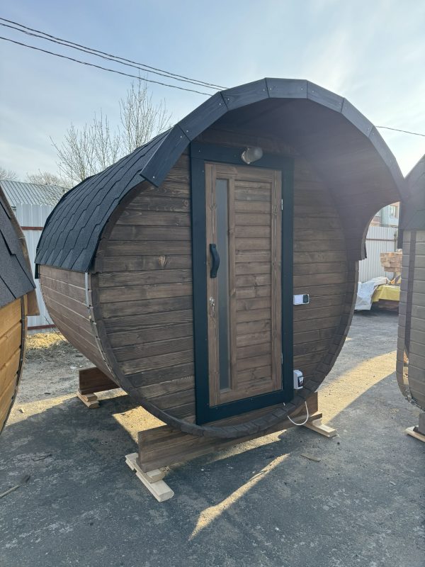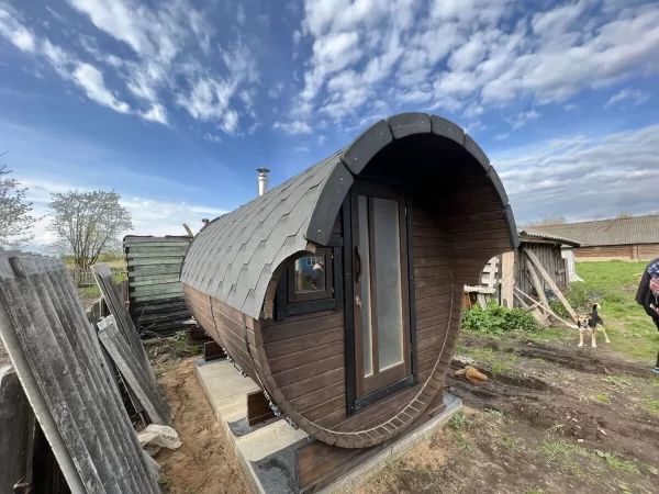 Баня-бочка с одним парильным помещением и козырьком над входом. Подойдет для небольшого участка и для использования в теплое время года. Козырек позволяет разместить под ним вешалку для вещей, для комфортного пользования баней в непогоду.