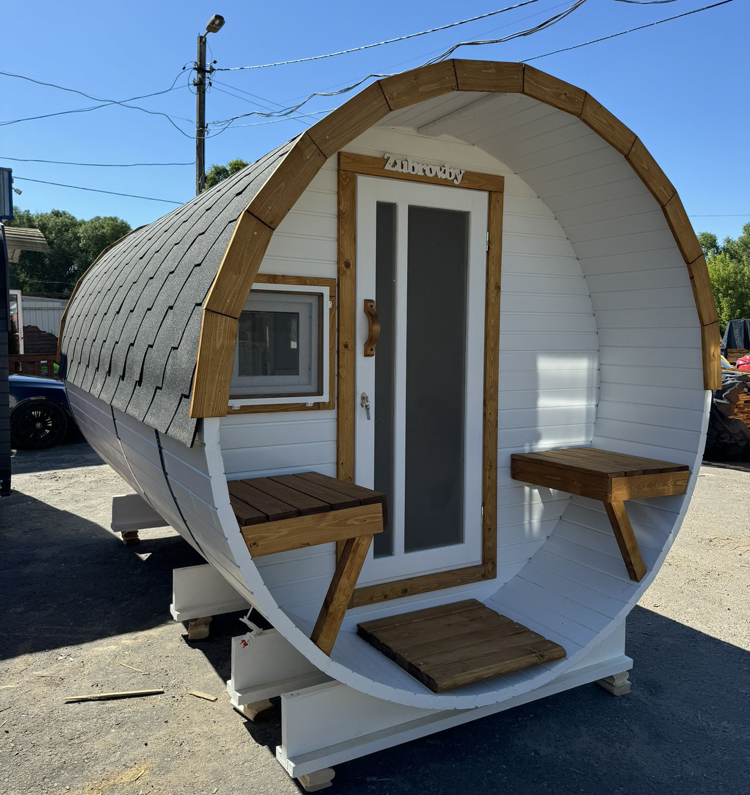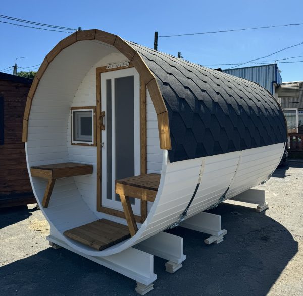 Компактная баня-бочка 3×2 м. Идеально размещается даже на небольшом участке, быстро нагревается, экономит пространство и средства.