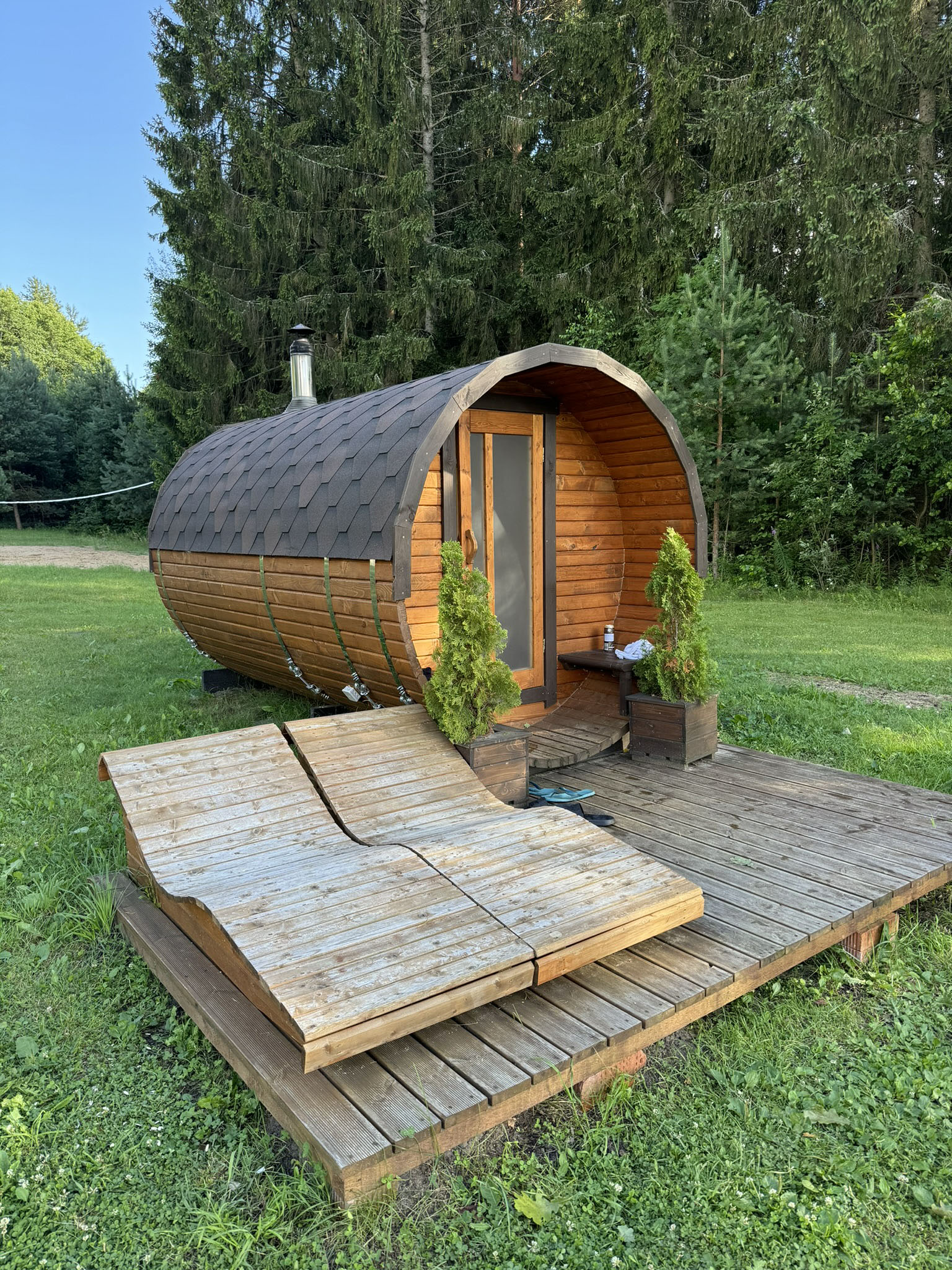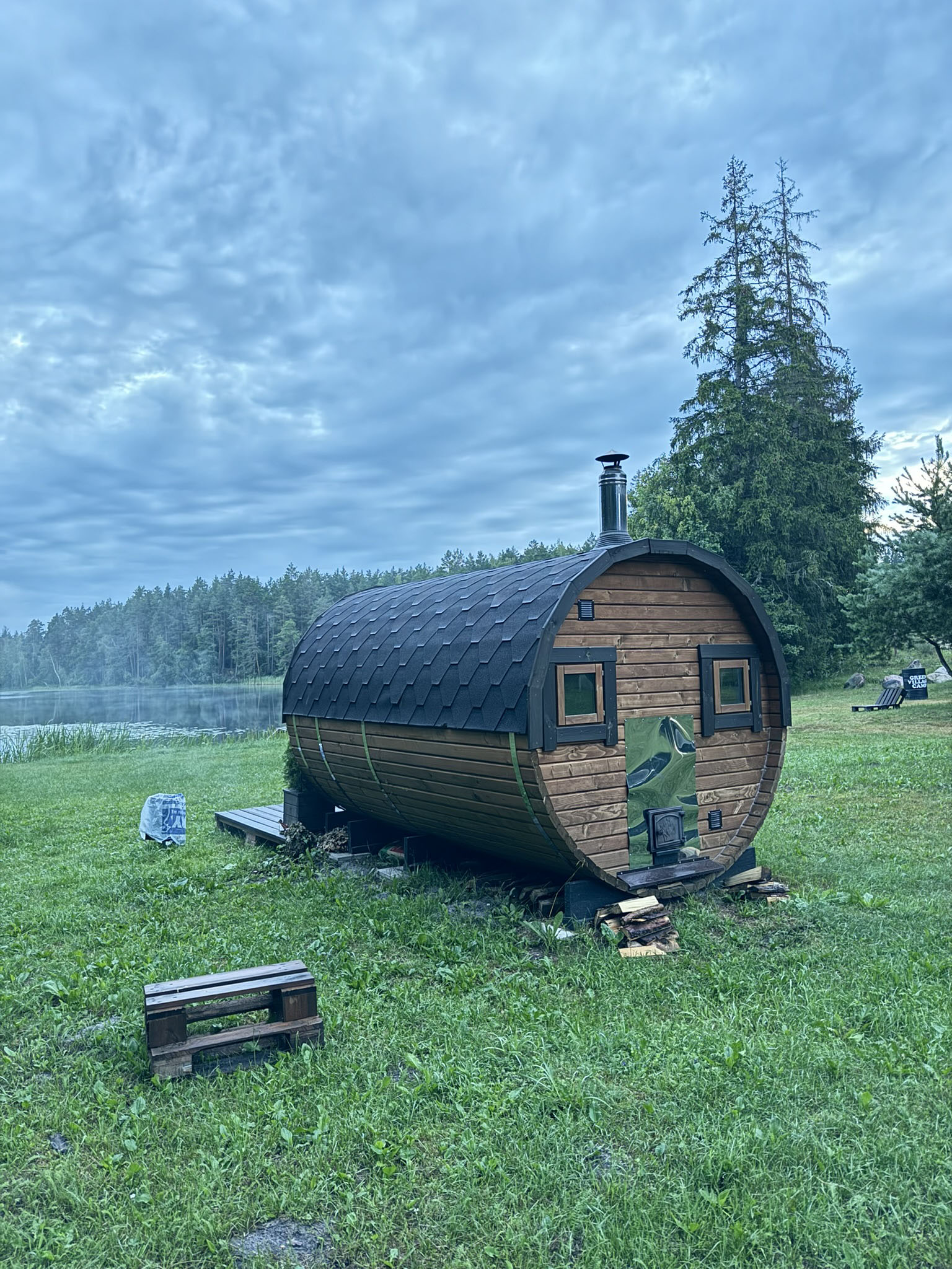 Баня-бочка, идеально подходящая для размещения возле воды. Отдых на собственной террасе с прекрасным видом.